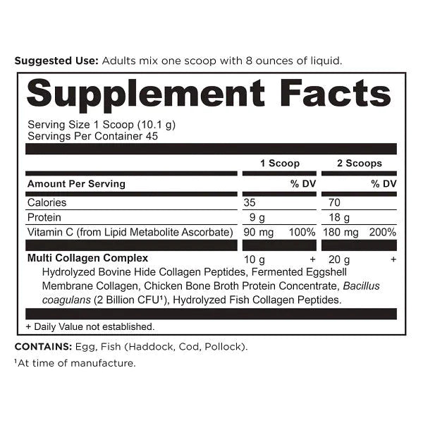 Hydrolyzed Bovine Hide Collagen Peptides, Fermented Eggshell Membrane Collagen, Chicken Bone Broth Collagen Concentrate, Bacillus coagulans (2 Billion CFU), Hydrolyzed Fish Collagen Peptides